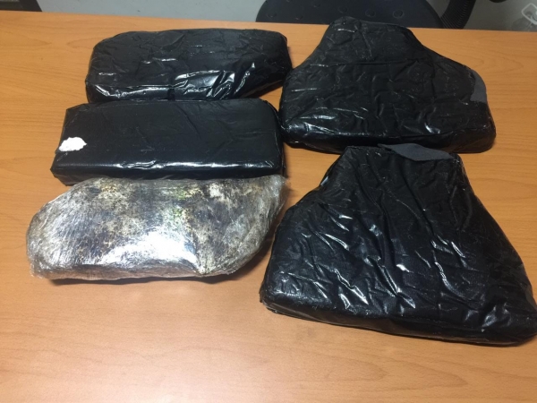 En ese momento y en presencia de un fiscal adjunto se procedió a requisar en el equipaje, ocupando en su interior un bulto de color negro con cinco paquetes presumiblemente cocaína o heroína, con un peso preliminar de 6.20 kilogramos.