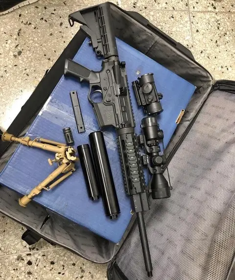 Mientras que mediante una requisa en el interior de la residencia, fueron encontrados en varios lugares 2,533 cápsulas y cartuchos de diferentes calibres, 9 cargadores de armas de fuego de diferentes calibres, un fusil American Tactical Omni Hybrid 5.56mm AR-15, de numeración ilegible, cañón 5.56 NATO 1/8, un bípode, dos supresores de sonido/silenciadores (de tamaño diferentes), dos miras telescópicas (de alcance diferentes) una linterna táctica color negro, dos chamacos militares de camuflaje con su bota, varios documentos.