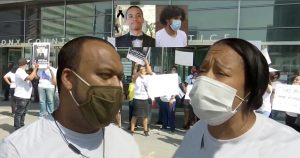 Winston Ortiz, padre del estudiante asesinado y quemado vivo por Adonis Betances (con mascarilla) y una tía de la víctima, Nancy Tamarez
