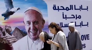 People walk past a billboard welcoming Pope Francis, at St. Mark’s Cathedral in Cairo, Egypt, Thursday, April 27, 2017. On Friday, Francis is scheduled to begin a two-day pilgrimage to Egypt aimed at lifting the spirits of Christians in the Middle East, whose numbers have rapidly dwindled in recent decades due to war, displacement and emigration. The visit will include a meeting with Egypt’s president and the Grand Imam of Al-Azhar as well as a Mass in a stadium on the outskirts of Cairo. (AP Photo/Amr Nabil)