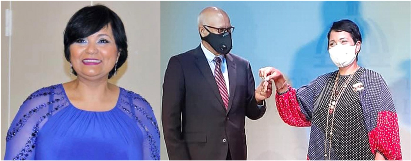 Lourdes Batista Jakab, Comisionada de Cultura en Estados Unidos, a la derecha, recibe la llave del comisionado saliente Carlos Sánchez