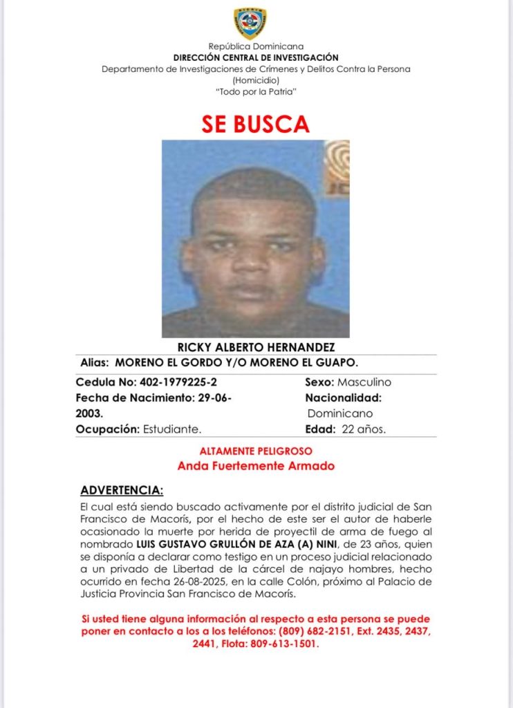 San Francisco de Macorís, provincia Duarte. – La Policía Nacional identificó a Ricky Alberto Hernández, alias “Moreno El Gordo” y/o “Moreno El Guapo”, de 22 años, como el presunto responsable de la muerte a tiros de Luis Gustavo Grullón de Aza (Nini), de 23, ocurrida la mañana del martes 26 de agosto de 2025 en la calle Colón, próximo al Palacio de Justicia de San Francisco de Macorís.