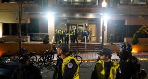 Los manifestantes se tomaron del brazo frente a la entrada del edificio, donde algunos cantaron: «¿De qué lado estás?». Los agentes empujaron y tiraron a los manifestantes para intentar sacarlos del área, y en un momento empujaron a un manifestante por una escalera que conducía a la entrada.