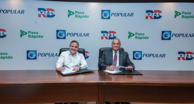 Santo Domingo, D.N. – El Banco Popular Dominicano y el fideicomiso público RD Vial suscribieron un acuerdo para ofrecer a los clientes de la entidad bancaria la posibilidad de recargar el servicio de “Paso Rápido” a través de sus canales digitales, Internet Banking y App Popular, así como en las áreas de caja de sus sucursales a nivel nacional, lo cual agrega valor a los clientes de la organización financiera, que podrán viajar de forma más ágil y eficiente por la principal red de carreteras dominicanas con estaciones de peaje.
