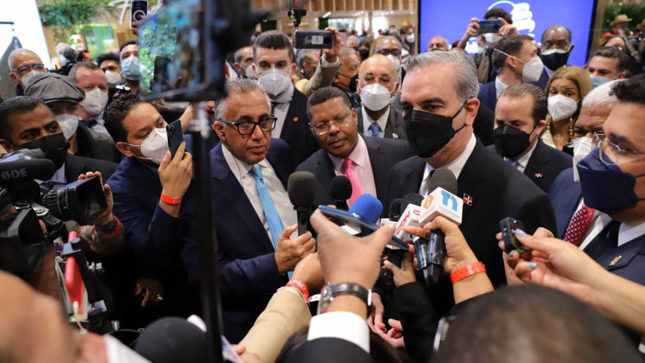 El presidente Abinader dio estas declaraciones al hablar con los medios de comunicación después de realizar el recorrido por los stands de Fitur junto a su comitiva y el Rey de España.