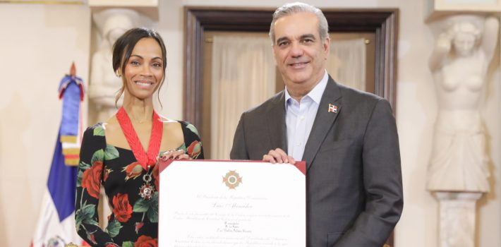 Santo Domingo.- El presidente Luis Abinader, junto con la vicepresidenta Raquel Peña y la primera dama Raquel Arbaje, condecoró este miércoles a la destacada actriz dominicana Zoe Saldaña con la Orden Heráldica de Cristóbal Colón, en el Grado de Comendador, en reconocimiento a su exitosa trayectoria en la industria cinematográfica y su contribución a la proyección internacional de la cultura dominicana.