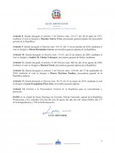 SANTO DOMINGO,-El presidente de la República, Luis Abinader, emitió este sábado el decreto 382-20 que deroga varias  disposiciones del Poder Ejecutivo que nombraba a 14 procuradores adjuntos, entre ellos a Bolívar Sánchez y a Marisol Tobal.
