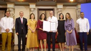 La vicepresidenta Raquel Peña y la primera dama Raquel Arbaje acompañaron al mandatario en el Salón Las Cariátides del Palacio Nacional, donde también fueron galardonados 10 maestros en Excelencia Docente por las instituciones de Educación Superior de la República Dominicana.