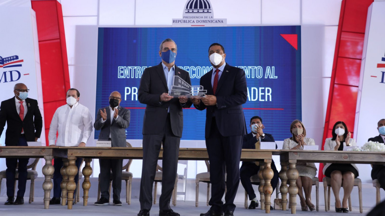 Previo a sus palabras, entregó un reconocimiento al mandatario Abinader por el apoyo a la municipalidad del país.