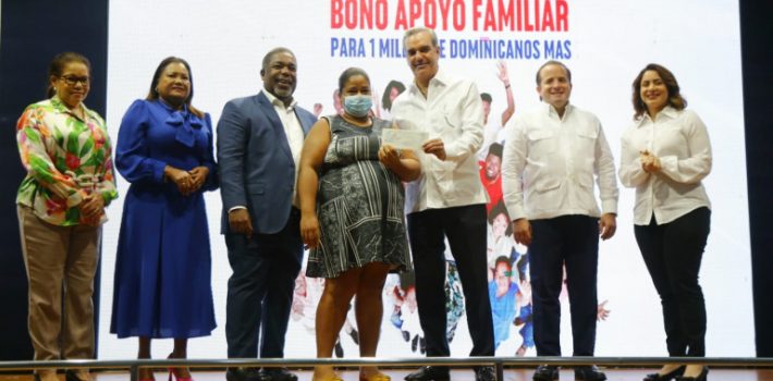 Santo Domingo Este.- El Presidente Luis Abinader lanzó este lunes el Bono de Apoyo Familiar, el cual beneficiará a un millón de hogares con el pago de un monto único de RD 1,500, que busca mitigar y contrarrestar los efectos de la crisis pospandémica y el incremento general de precios a nivel mundial.