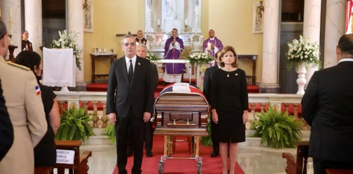 En la misa de cuerpo presente, oficiada por el sacerdote Frankelly Rodríguez en la parroquia San Rafael Arcángel del Palacio Nacional, el presidente Abinader recibió a la familia Jorge Villegas, integrada por la esposa de Jorge Mera, Patricia Villegas de Jorge, y sus hijos Orlando y Patricia Victoria, así como su hermana Dilia Leticia.