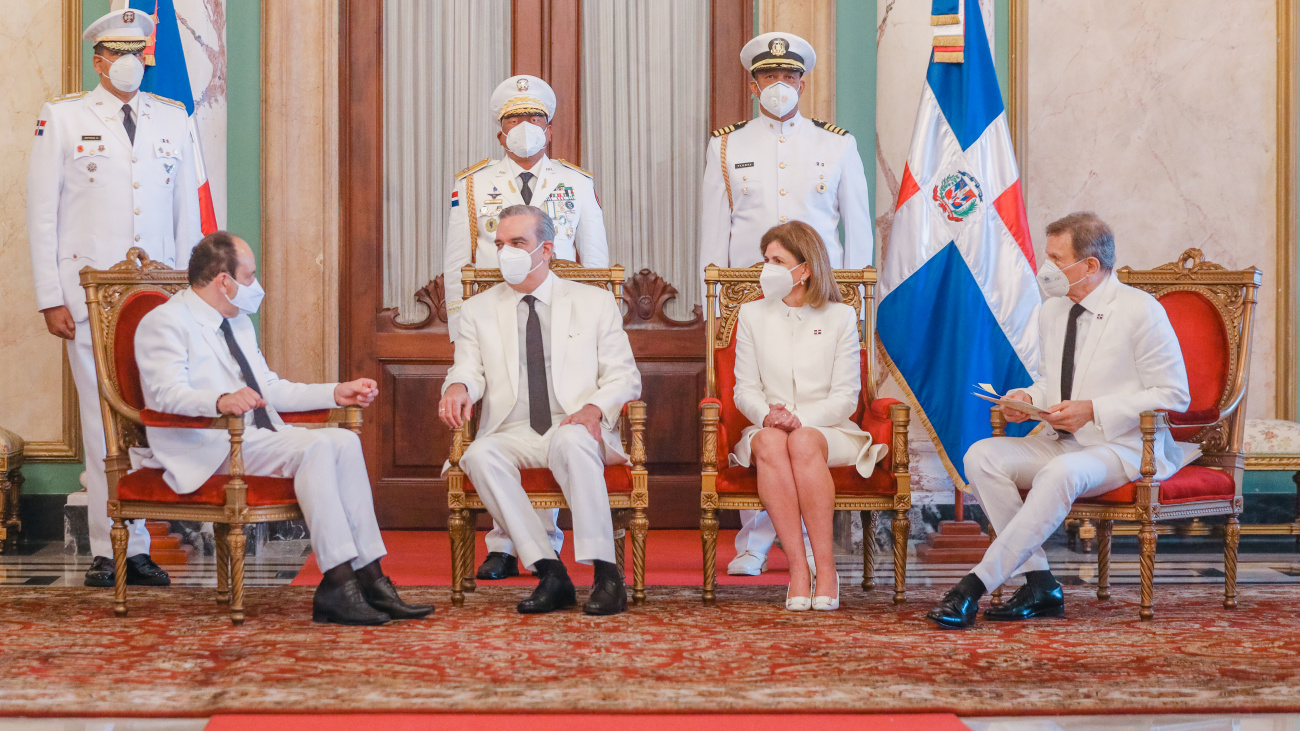 El acto protocolar se efectuó en el Salón de Embajadores del Palacio Nacional, donde el jefe de Estado estuvo acompañado de la vicepresidenta de la República, Raquel Peña, y del ministro de Relaciones Exteriores, Roberto Álvarez.
