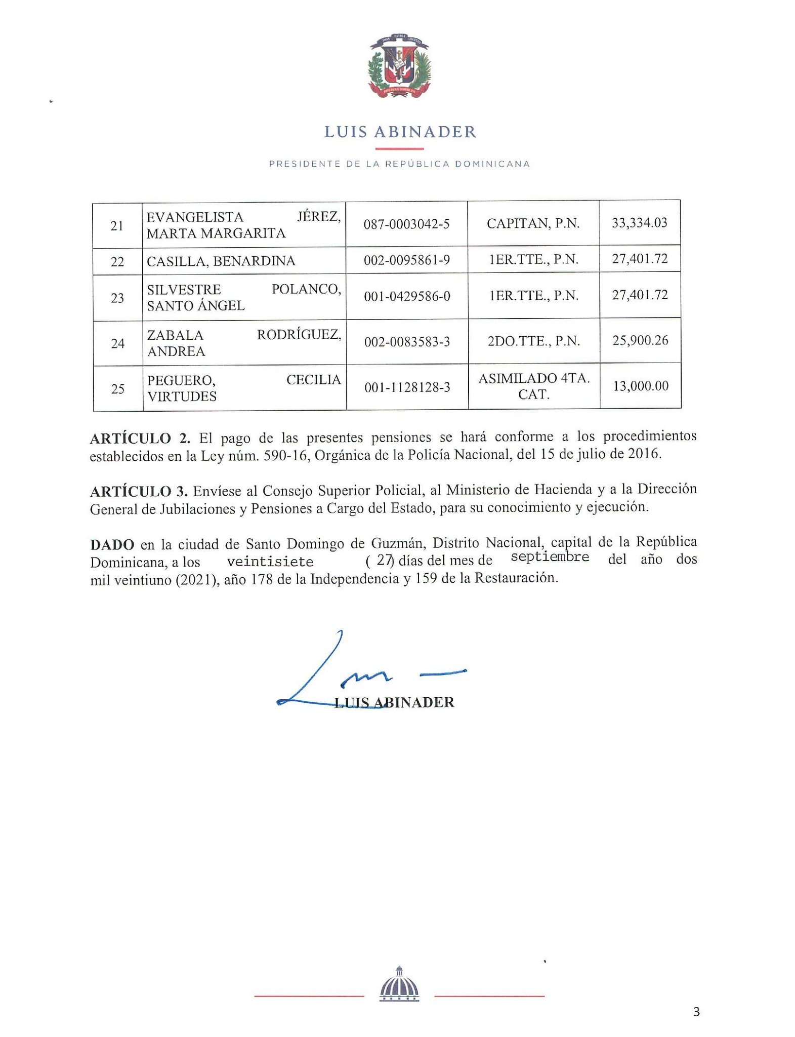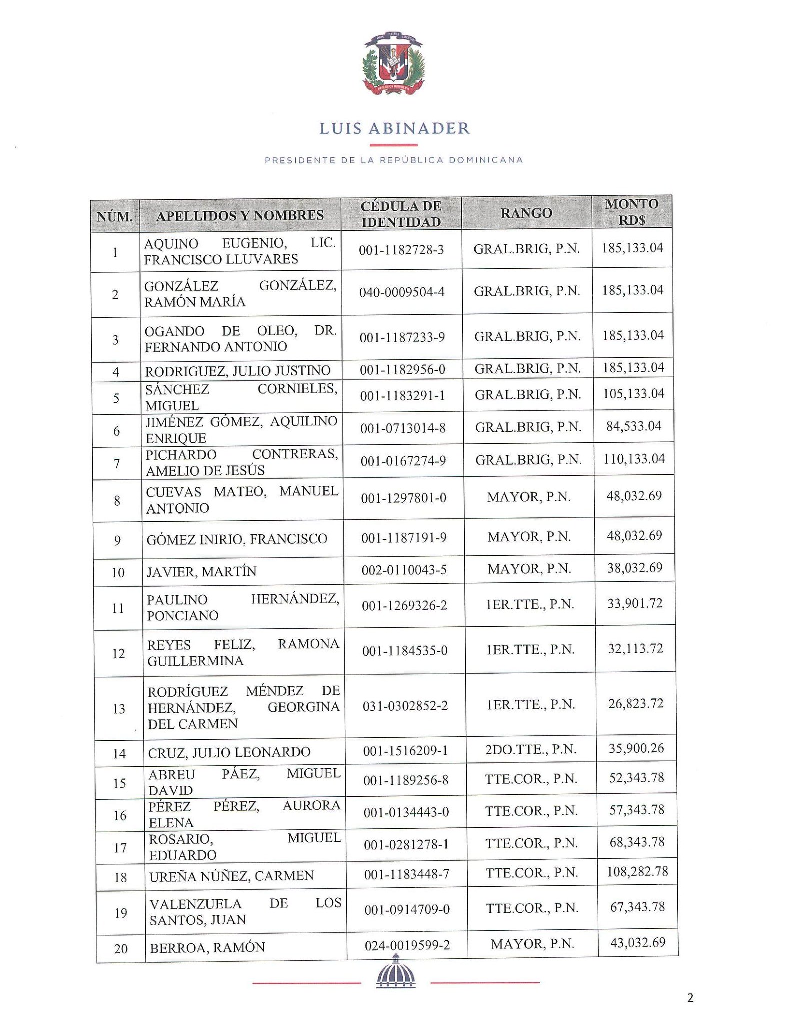 El presidente Luis Abinader dispuso este lunes el retiro de siete generales de brigadas y cinco tenientes coronales de la Policía Nacional.