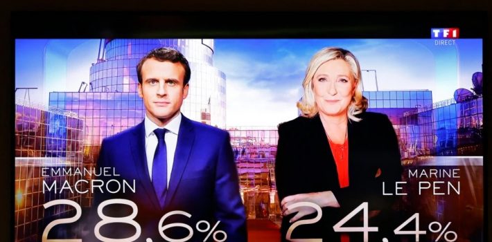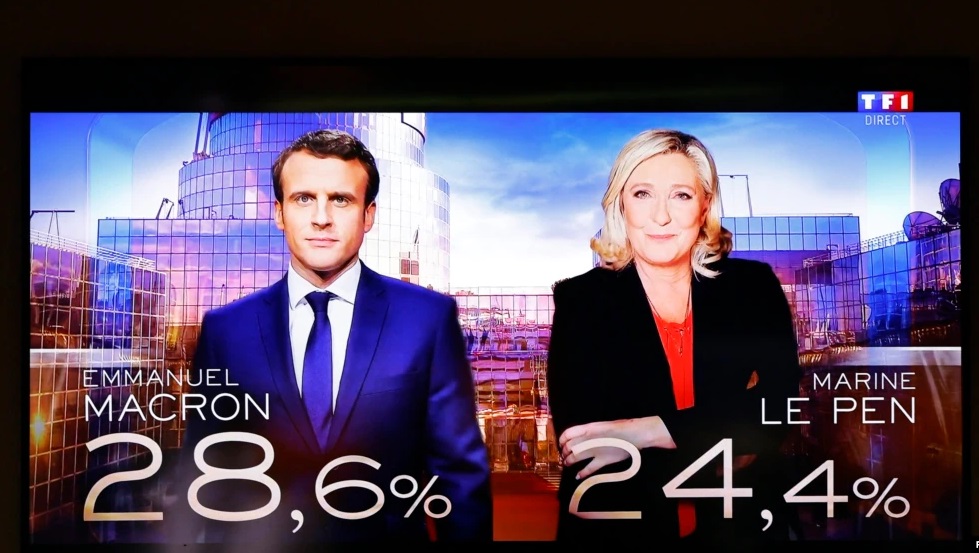 Macron ganó alrededor del 27% de los votos frente al 24% de Le Pen, con más del 90 % de los votos contados.