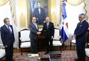 El exgobernante francés se mostró interesado en la visión de estadista de Danilo Medina, con quien conversó sobre comercio en América Latina, migración y los desafíos comerciales. En ese contexto, Hollande destacó la estabilidad, seguridad y el crecimiento de la República Dominicana. El expresidente francés estuvo acompañado de su esposa Juliet Gayet; el embajador de la referida nación europea en República Dominicana, Didier Lopinot; la embajadora dominicana en Francia, Rosa Hernández de Grullón; y el expresidente del Senado, Jean Pierre Bel.Fue introducido al despacho presidencial por el ministro de Relaciones Exteriores, Miguel Vargas Maldonado. El jefe de Estado dominicano estuvo acompañado, además, del ministro de la Presidencia, Gustavo Montalvo; y el portavoz del Gobierno y director general de Comunicación, Roberto Rodríguez Marchena.