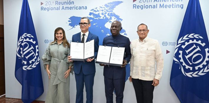 Punta Cana.- En el marco de la 20ª Reunión Regional Americana de la Organización Internacional del Trabajo (OIT), celebrada en Punta Cana, el ministro de Trabajo de la República Dominicana, Eddy Olivares, entregó en nombre del Gobierno dominicano, al director general del organismo, Gilbert Houngbo, el instrumento de ratificación del Convenio 156 de la OIT, sobre los trabajadores con responsabilidades familiares.