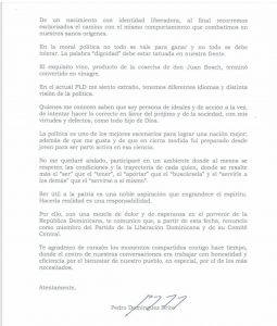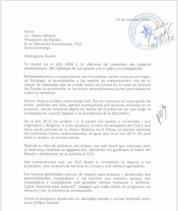 Mediante una misiva, dirigida al expresidente de la República y actual presidente del partido morado, Danilo Medina, Domínguez Brito sostuvo que los buenos peledeístas carecen de espacio para avanzar y desarrollar sus potencialidades.
