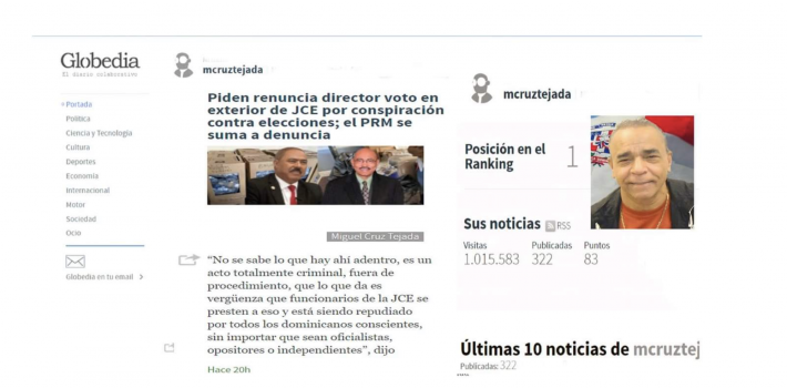 NUEVA YORK,-El reportero dominicano Miguel Cruz Tejada, sobrepasó ayer lunes el millón de entradas para posicionar número 1 en el ranking de publicaciones noticiosas multimedia en la plataforma internacional Globedia con sede en España y que abre espacios a colaboradores de Europa y otros continentes en el mundo.Con solo 322 notas publicadas, Cruz Tejada, suma 1.015.583 visitas a sus informaciones que difunden acontecimientos de Nueva York y otros estados de Estados Unidos, la diáspora dominicana y lo más destacado en otras esferas del epicentro mundial de las noticias que es la llamada Gran Manzana.