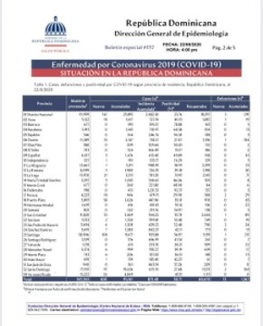 El organismo regulador de Salud informó de igual manera a través de este documento oficial realizado por la Dirección General de Epidemiologia que hasta la fecha se encuentran unos 266 casos en unidades de cuidados intensivos, distribuidos de la siguiente manera, un 39.85% en centros del Gran Santo Domingo, 32.71% en Santiago y 12.41% en Duarte. La mediana de edad del total de casos: 38 años.