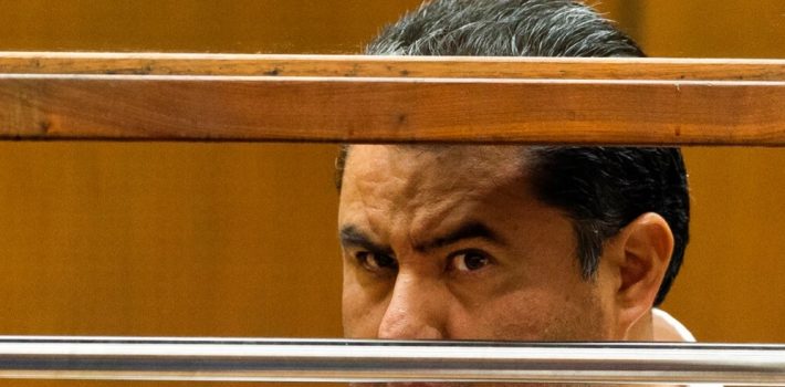 El acusado, vestido con el uniforme naranja de la prisión y con cubrebocas quirúrgico debajo de sus gafas, no se volteó a mirar a las mujeres. Permaneció sentado, con la vista al frente y las manos esposadas a la cintura, mientras escuchaba por audífonos a un intérprete al español.