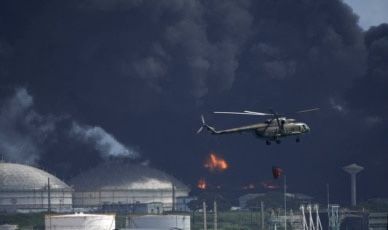 Con la ayuda de México y Venezuela, especialistas y bomberos cubanos buscaron el domingo apagar el fuego de grandes proporciones que se desató en una base de almacenamiento de combustible en la occidental provincia de Matanzas el viernes.