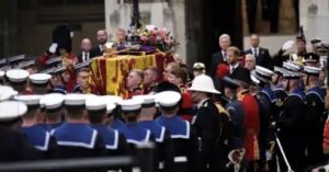 El ataúd de la reina fue transportado el lunes por la mañana a la Abadía de Westminster en el carruaje estatal de artillería de la Royal Navy, que fue arrastrado por 142 marineros. El carruaje también se usó para el funeral del padre de Isabel, el rey Jorge VI, en 1952.