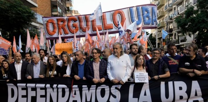 A fines de abril alumnos, trabajadores docentes y no docentes universitarios y sindicatos protagonizaron una multitudinaria marcha en Buenos Aires y otras ciudades argentinas en contra del congelamiento del presupuesto para las universidades nacionales. Más de 80 % de los gastos que tienen esos centros educativos son destinados a salarios.