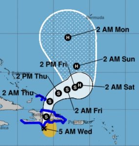 La tormenta tropical ha mantenido su rumbo anterior, avanzando hacia el norte a una velocidad de 17 kph. A las 7:00 a.m., se encontraba cerca de la latitud 17.6 norte y longitud 71.3 oeste, aproximadamente a 45 km al sur/suroeste de Paraíso, Barahona, y a unos 175 km al suroeste de Santo Domingo.