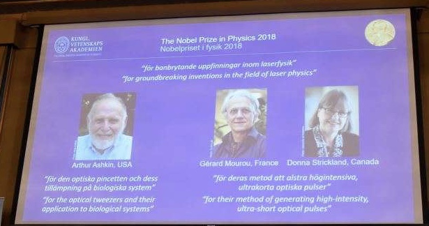 La Real Academia de las Ciencias de Suecia concedió la mitad del galardón de nueve millones de coronas (1,01 millones de dólares) al estadounidense Arthur Ashkin. La otra mitad se repartirá entre el francés Gerard Mourou y la canadiense Donna Strickland.