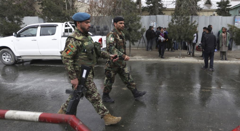 Afghan Soldiers inspect the site of attack on a military hospital in Kabul, Afghanistan, Wednesday, March 8, 2017. Gunmen stormed a military hospital in Afghanistan’s capital on Wednesday, killing at least four people and wounding more than 60, setting off clashes with security forces that were still underway hours later. (AP Photo/Rahmat Gul)