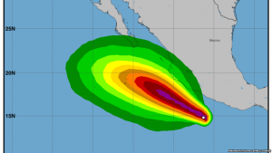 El meteoro tenía vientos máximos sostenidos de 85 kph (50 mph) y los meteorólogos creen que tome fuerza de huracán el lunes, mientras se mueve más o menos en paralelo a la costa. Prevén que luego haga una curva hacia el oeste.