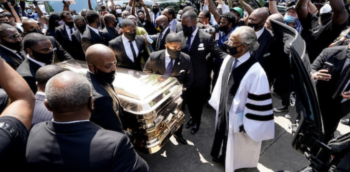 El cuerpo de Floyd llegó a la iglesia Fountain of Praise el martes para un funeral privado, culminando seis días de duelo por Floyd, quien murió en Minneapolis después de que Derek Chauvin, un agente de policía, ahora despedido de la fuerza y acusado de asesinato, presionara su rodilla contra su cuello durante casi nueve minutos.
