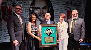 El galardonado, como siempre, mostrando su eterna sonrisa, recibió muy emocionado la gran distinción entregada oficialmente por la licenciada Ana Elsa Santos, presidente de UDESA; licenciado Emmanuel García Musa, secretario general de la entidad; doña Julia Lora de Hieronimus, madre del deporte de Santiago y el licenciado Guillermo José Saleta Pérez.