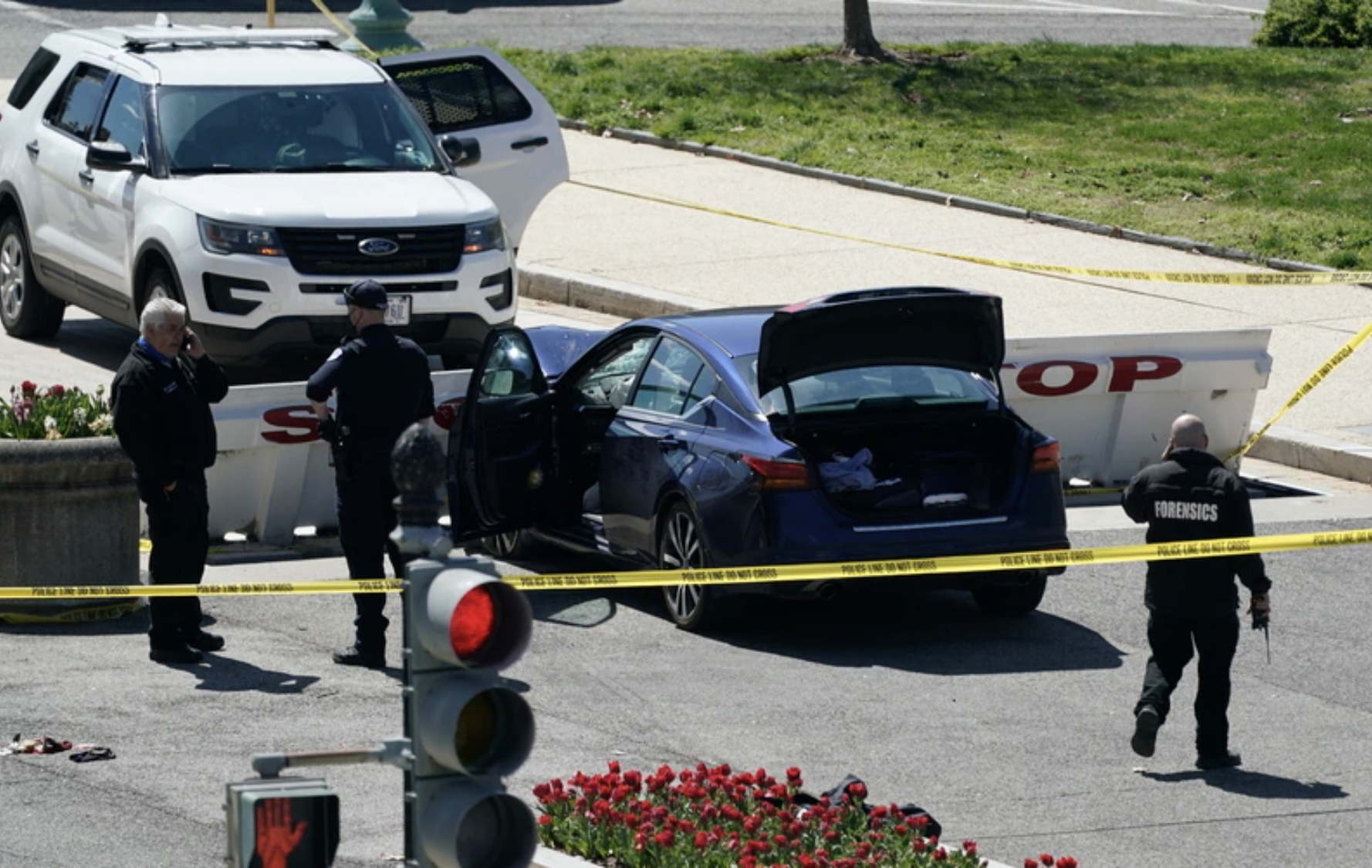 Los hechos tuvieron lugar en torno a la una de la tarde, cuando un automóvil de color azul se desvió de su vía para embestir a dos agentes que hacían guardia en los accesos de la sede del Legislativo, antes de estamparse contra una de las barricadas de hormigón que salvaguardan el acceso al Capitolio.