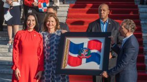 Posteriormente, Uribe hizo entrega a la Vicepresidenta Raquel Peña, de la bandera nacional y el escudo nacional en arte hilográfico.