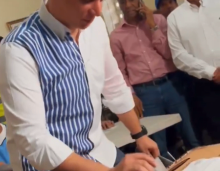 Acompañado de su padre, Monchy Fadul, y Marino Collante, llegó caminando al colegio electoral 195 en la calle Mella esquina Restauración de Santiago.