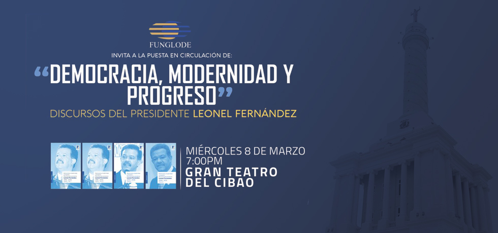 El expresidente de la República y presidente de la Fundación Global, Democracia y Desarrollo (Funglode), Leonel Fernández, pone en circulación del libro “Democracia, Modernidad y Progreso”, compilación de discursos políticos, desde el Gran Teatro del Cibao en Santiago.