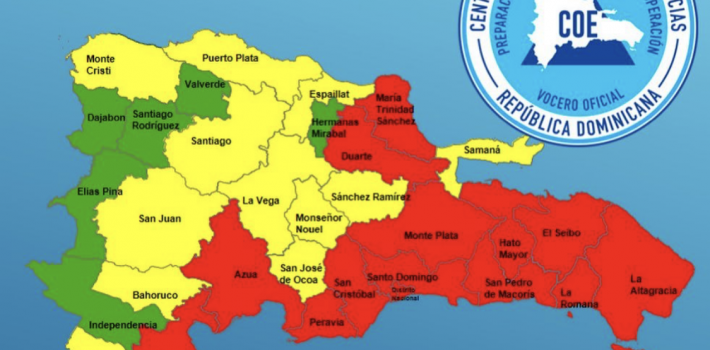 Las provincias en alerta roja están San Cristóbal, La Romana, La Altagracia, San Pedro de Macorís, Barahona, Azua, Peravia, María Trinidad Sánchez, Monte Plata, Duarte, Hato Mayor,  Seibo y el Gran Santo Domingo.