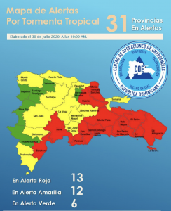 Las provincias en alerta roja están San Cristóbal, La Romana, La Altagracia, San Pedro de Macorís, Barahona, Azua, Peravia, María Trinidad Sánchez, Monte Plata, Duarte, Hato Mayor, Seibo y el Gran Santo Domingo.